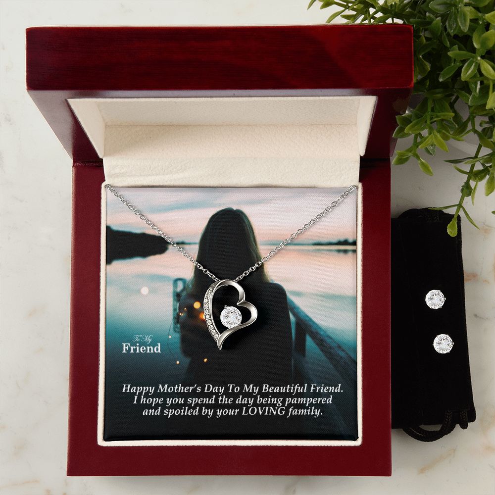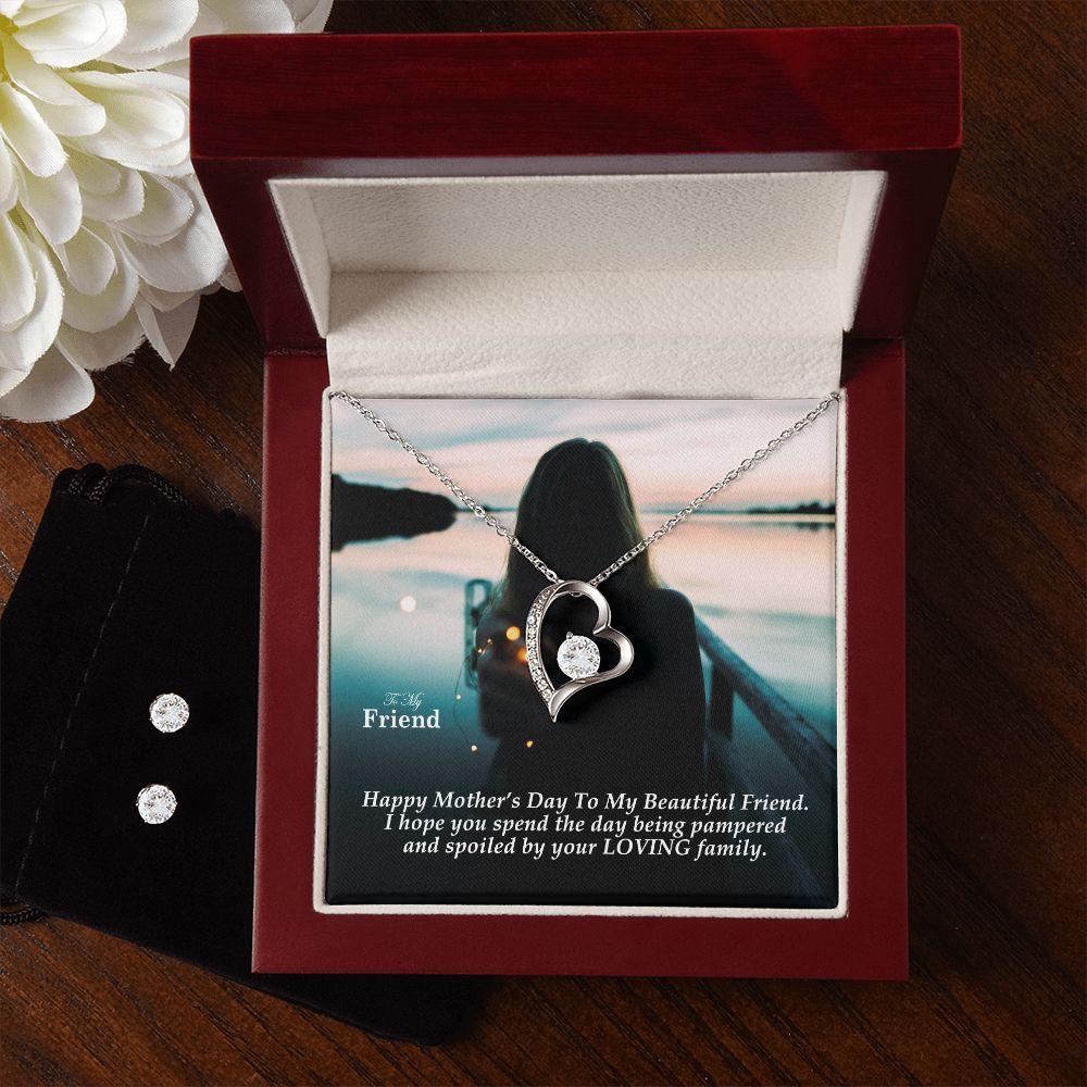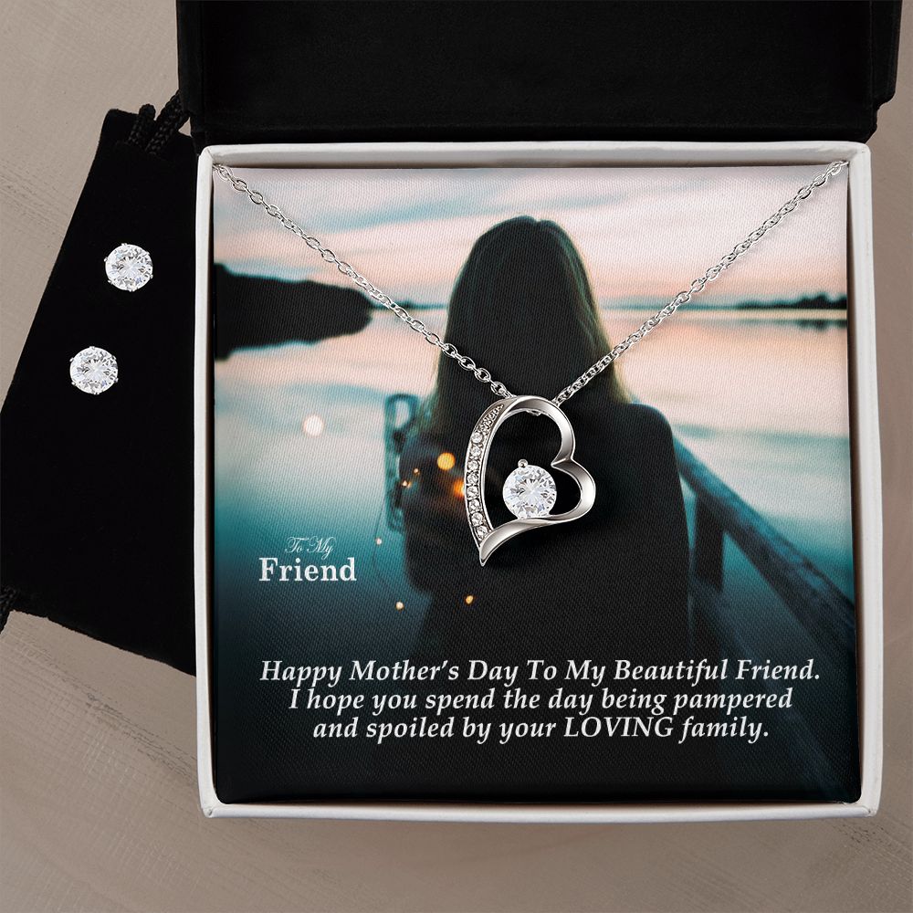Happy Mother's Day To My Beautiful Friend - I Hope You Spend The Day Being Pampered & Spoiled By Your Loving Family - Forever Love Necklace & Clear CZ Earrings - Gift for Friend
