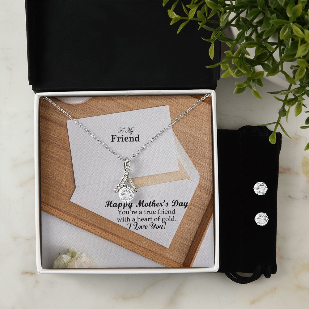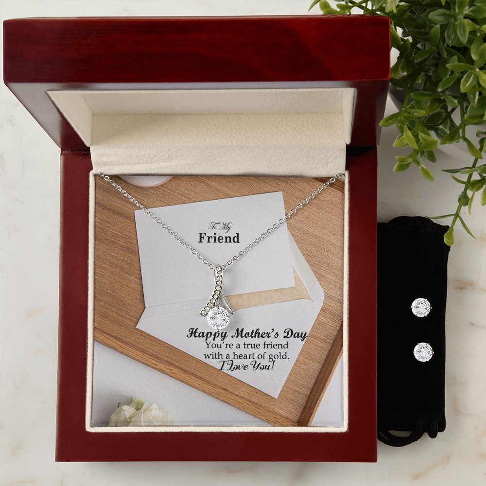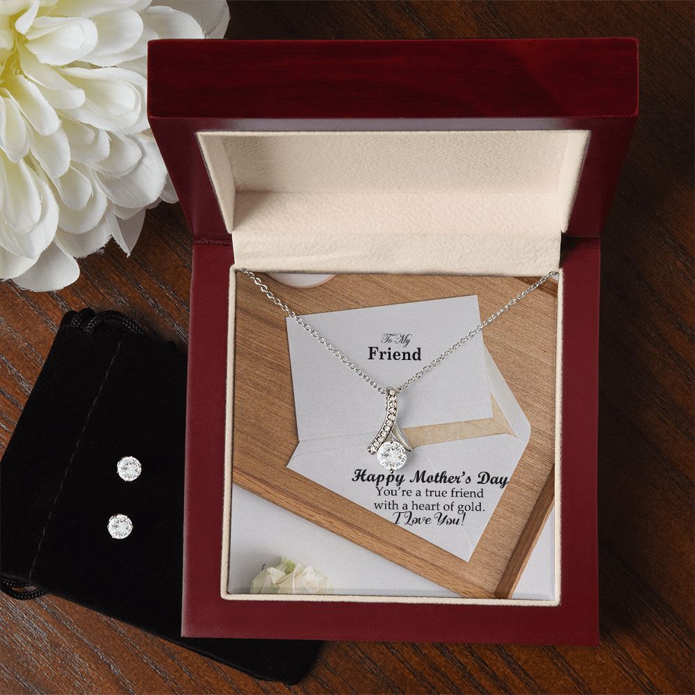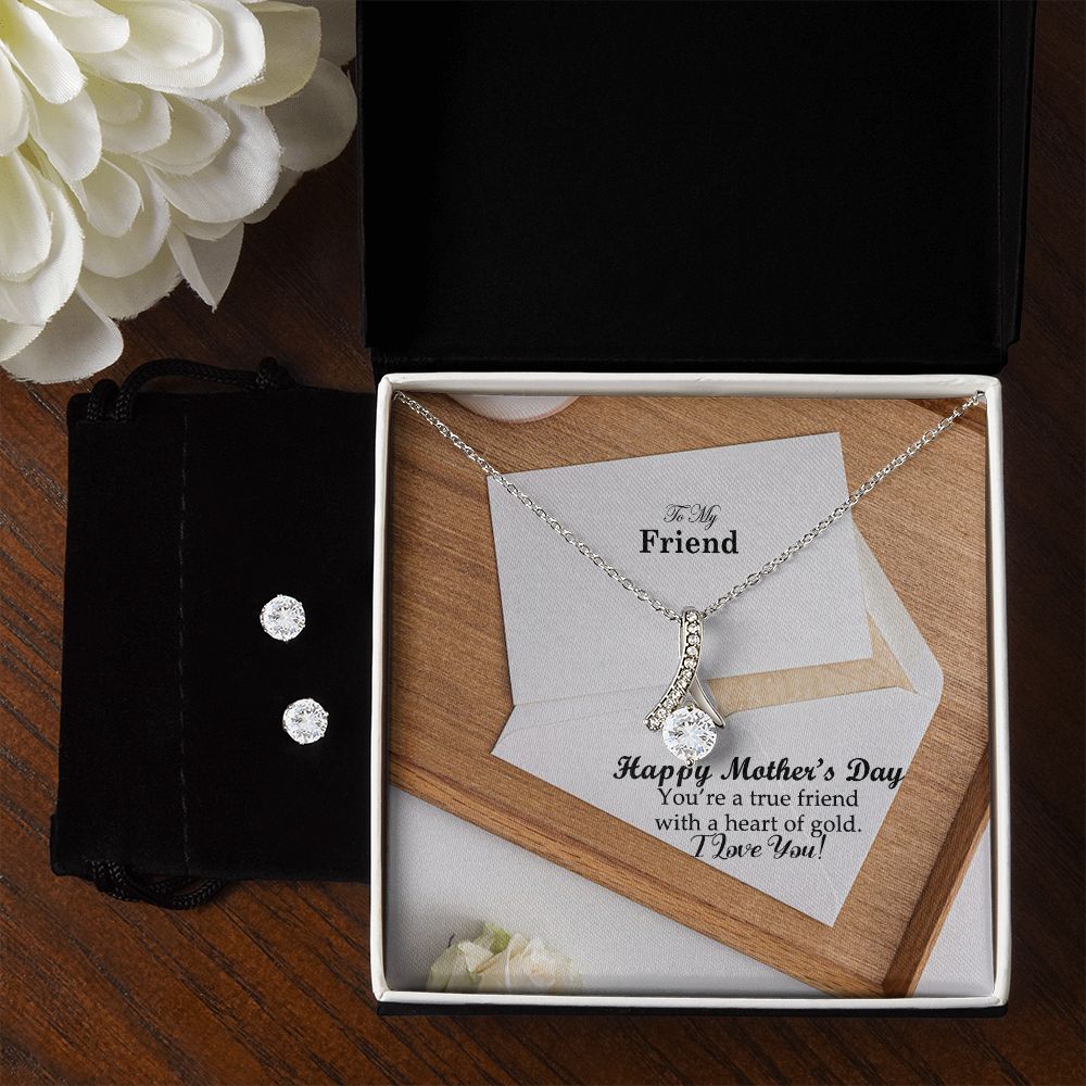 Happy Mother's Day - You're A True Friend With A Heart Of Gold - Alluring Beauty Necklace & Clear CZ Earrings - Gift for Friend
