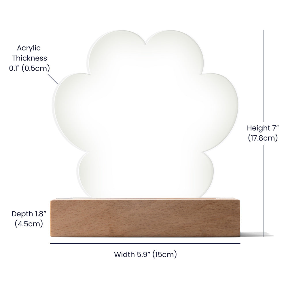 Your plaque will be crafted from premium acrylic with a professionally printed design for a polished look. It comes with a stylish wooden LED base, and you can choose between a USB plug-in option OR a cordless battery-operated option (requires 2 AAA batteries, not included). Both LED bases feature 7 vibrant colors, allowing the user to customize the lighting with various color changes and dynamic cycles.