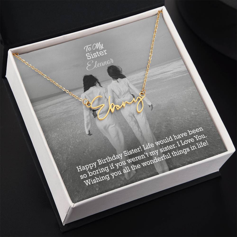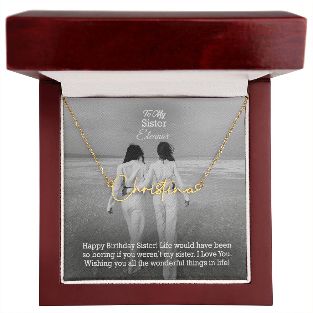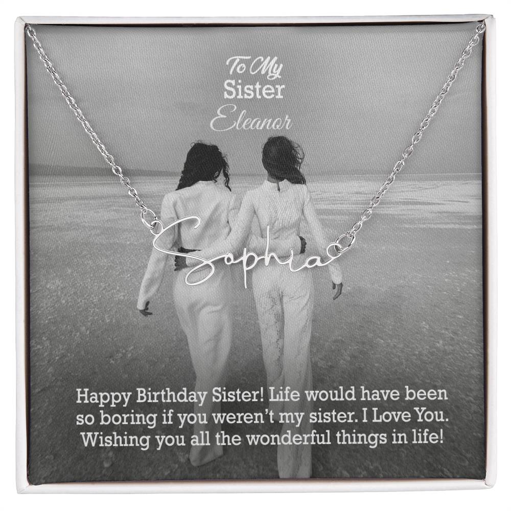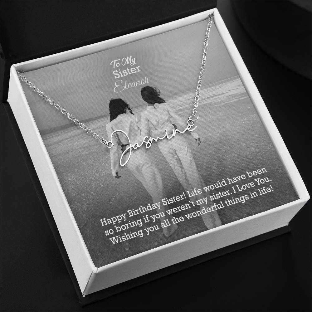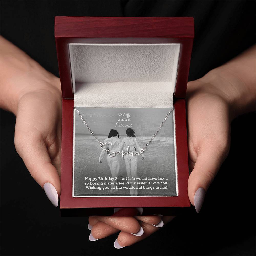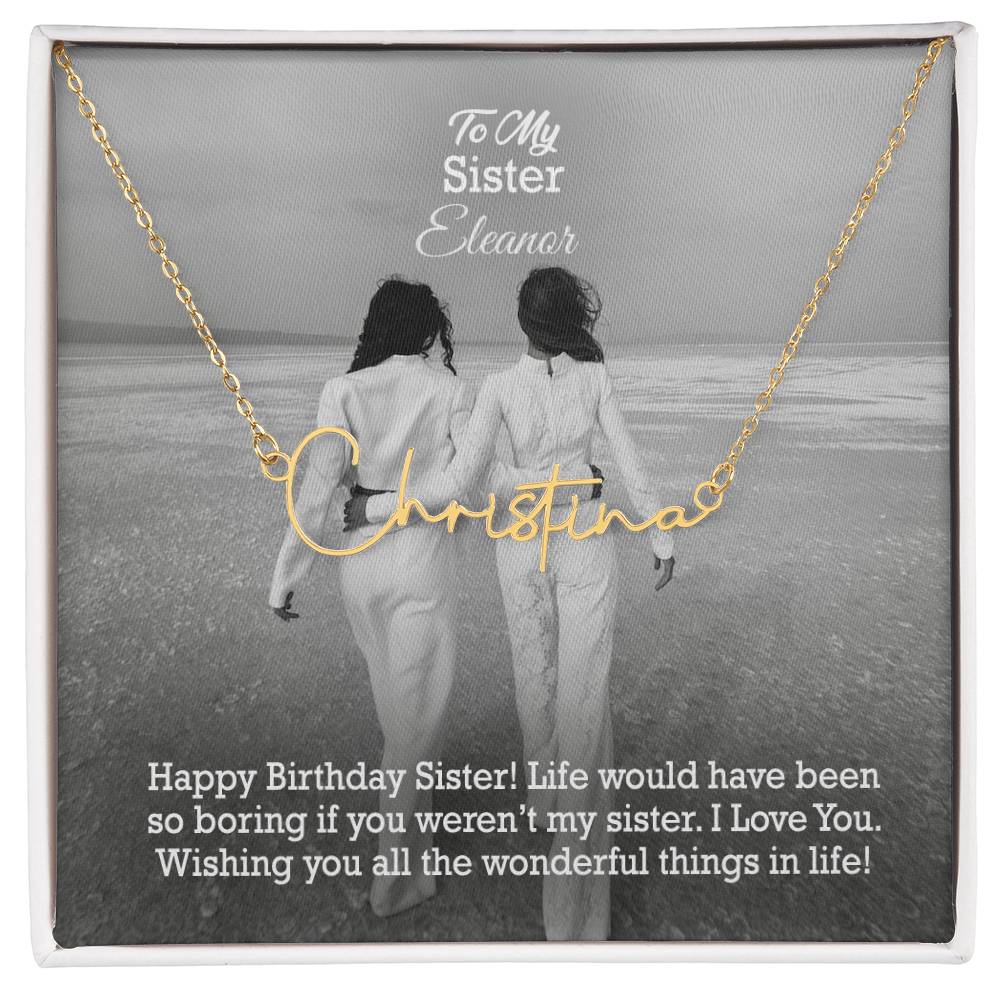 To My Sister, Happy Birthday - Life Would Have Been So Boring If You Weren't My Sister - Signature Name Necklace with Message Card - Gift for Sister