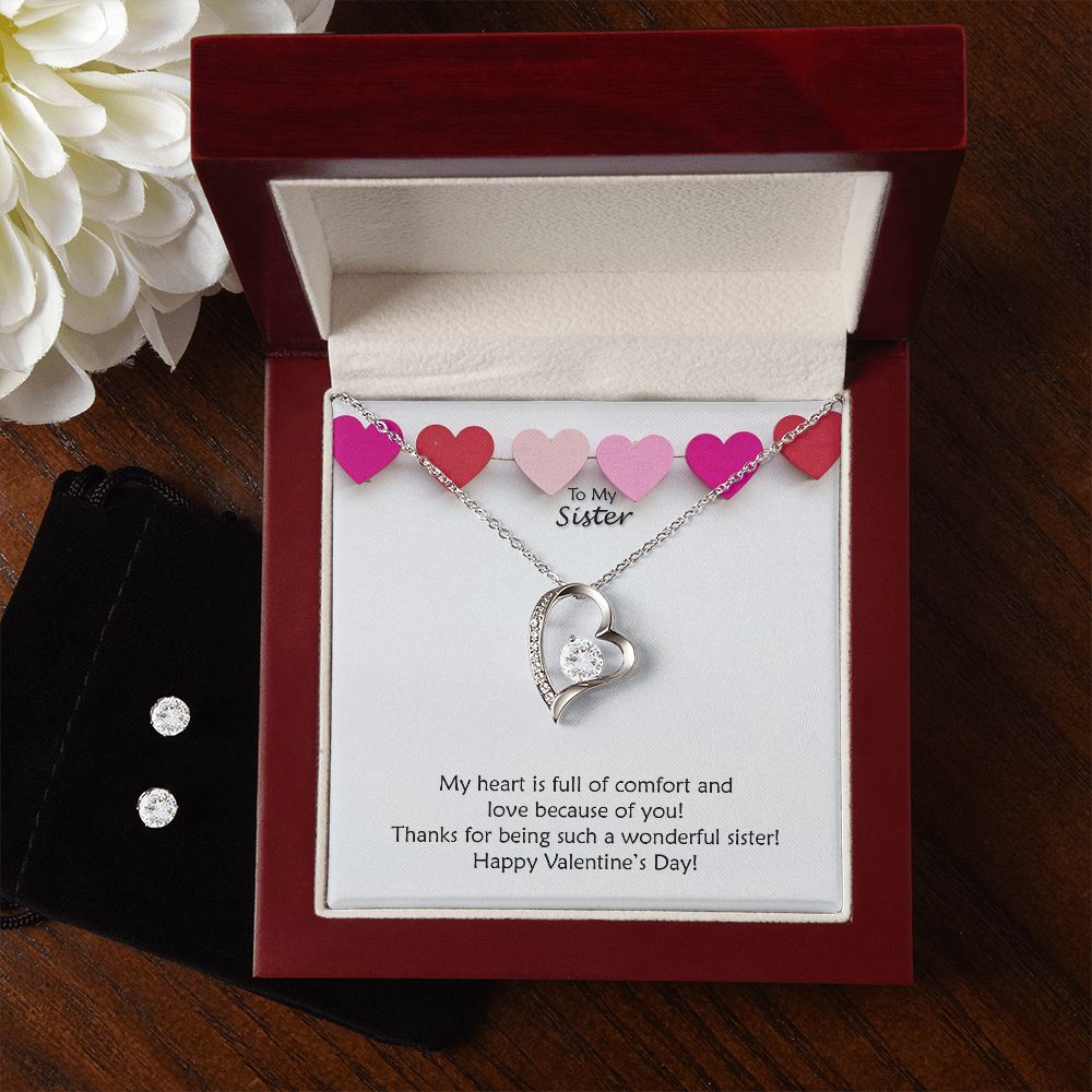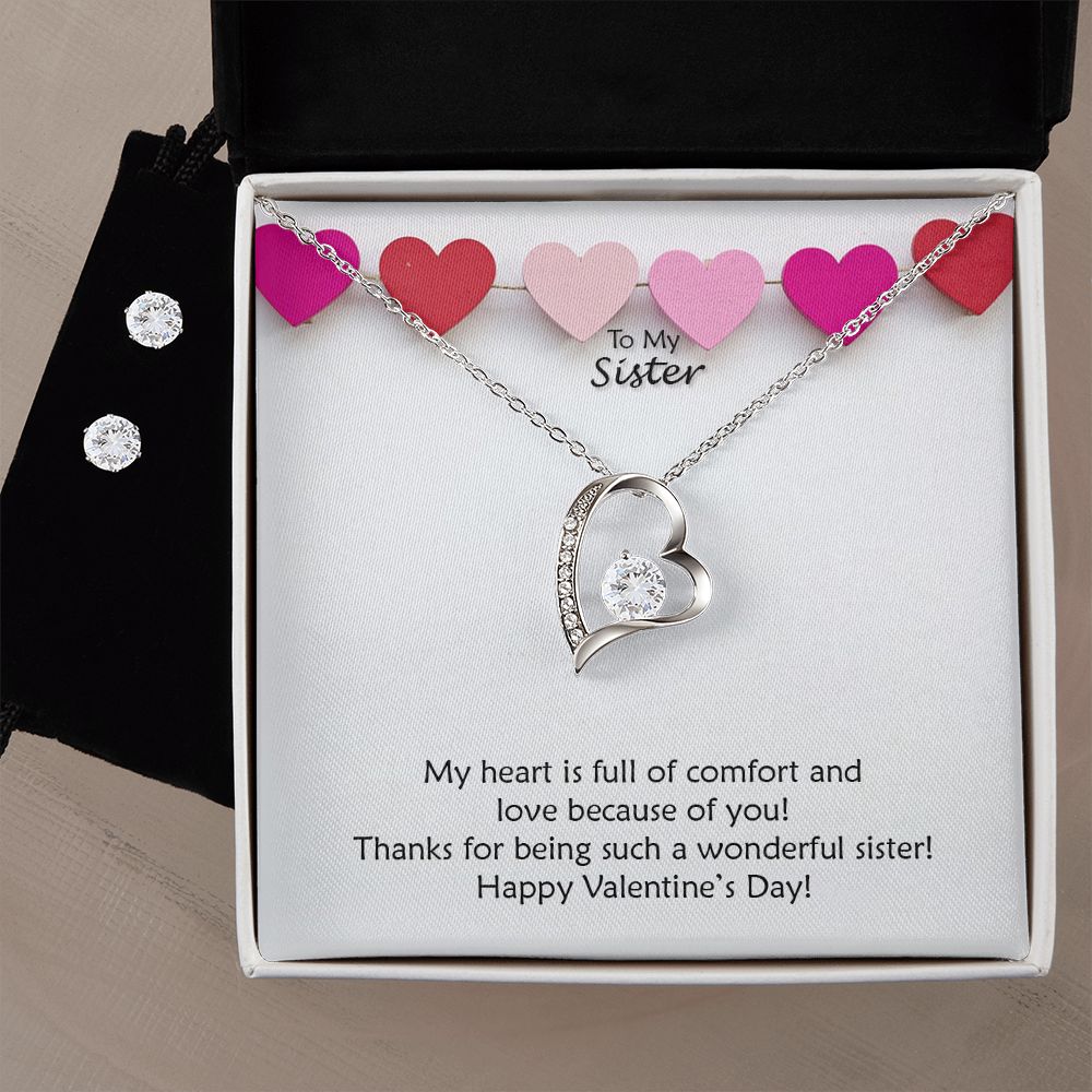 To My Sister, Thanks For Being Such A Wonderful Sister Happy Valentine's Day - Forever Love Necklace & Clear CZ Earrings - Gift for Sister