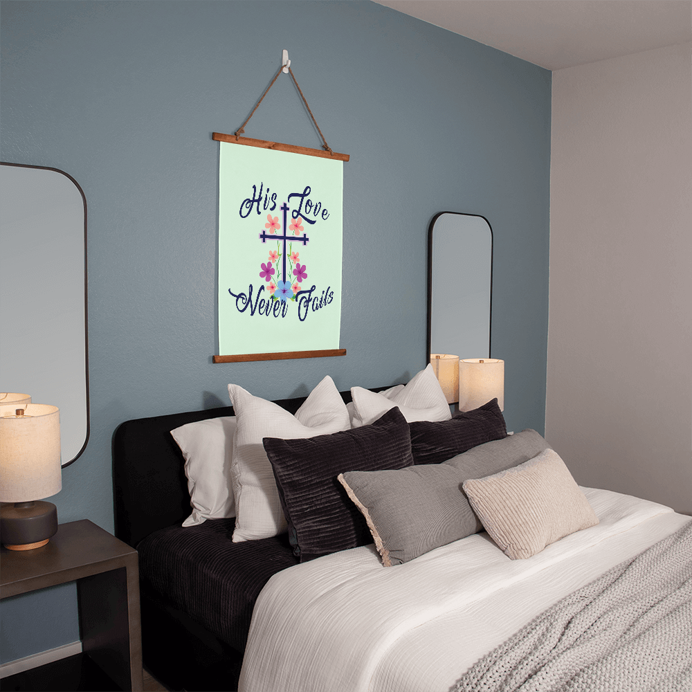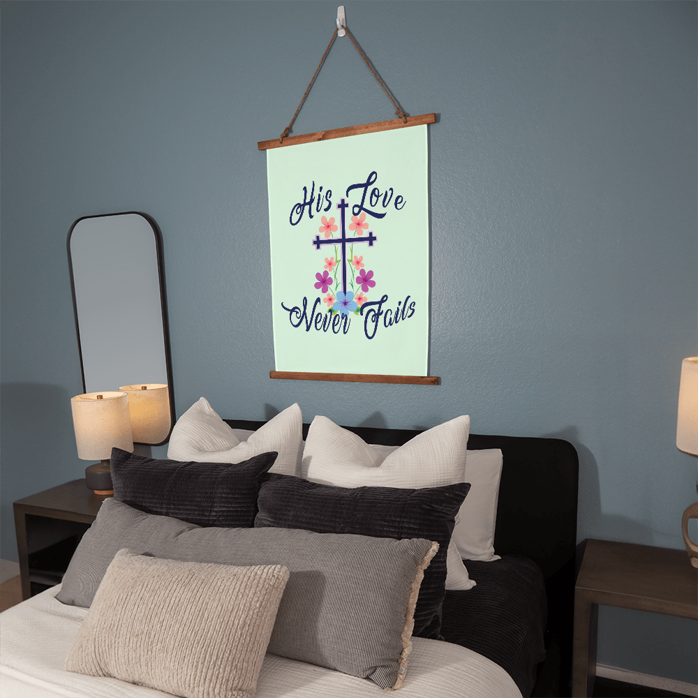His Love Never Fails - Wood Framed Wall Tapestry (Portrait) - Gift for Her